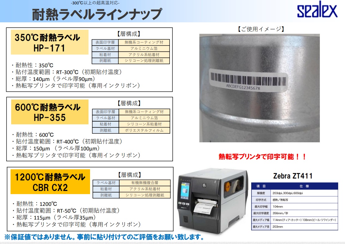 非RFIDの一次元/二次元のバーコードでの個体識別向けには、耐熱 1200℃ / 600℃ / 350℃ のラベルラインナップを用意しています。